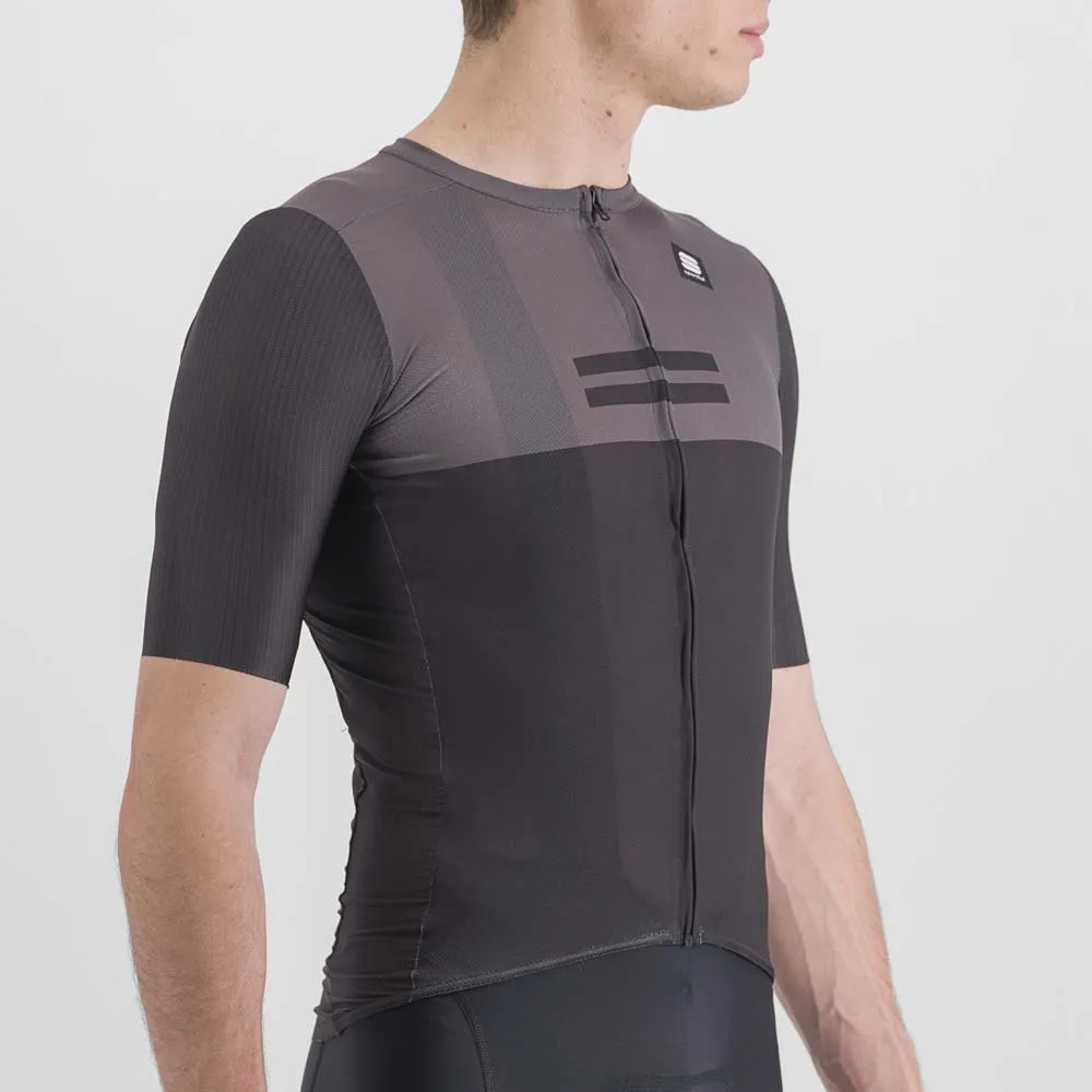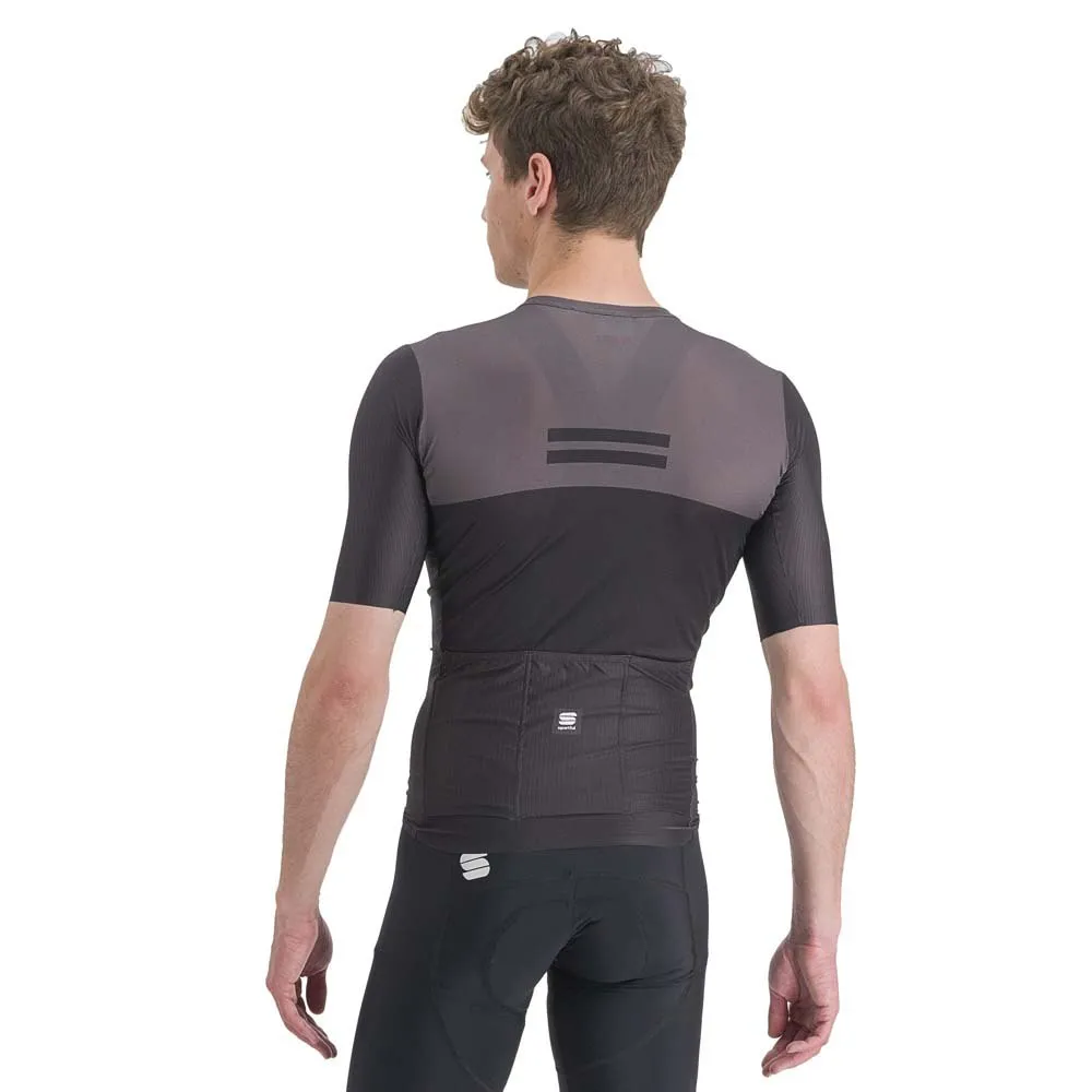 Lightweight, breathable polyester fabric with microstructure Side panels and pockets in more open-weave polyester for greater ventilation Micromesh sleeves with raw-cut edge Grip tape at bottom of jersey and 3 gusseted pockets: excellent capacity and stability.